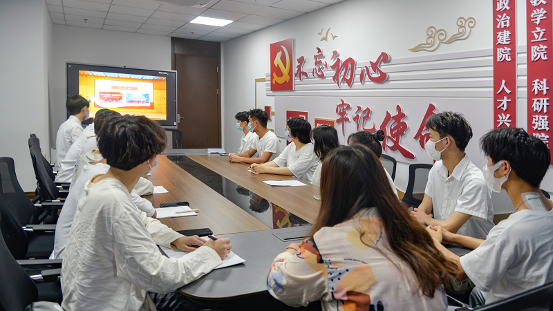 团工作负责人康颖、院团委全体学生骨干在立言楼239集中观看直播课。