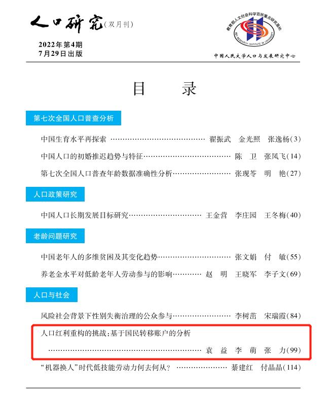 直播比分 青年教师袁益博士及其合作者在《人口研究》2022年第4期发表文章《人口红利重构的挑战:基于国民转移账户的分析》。