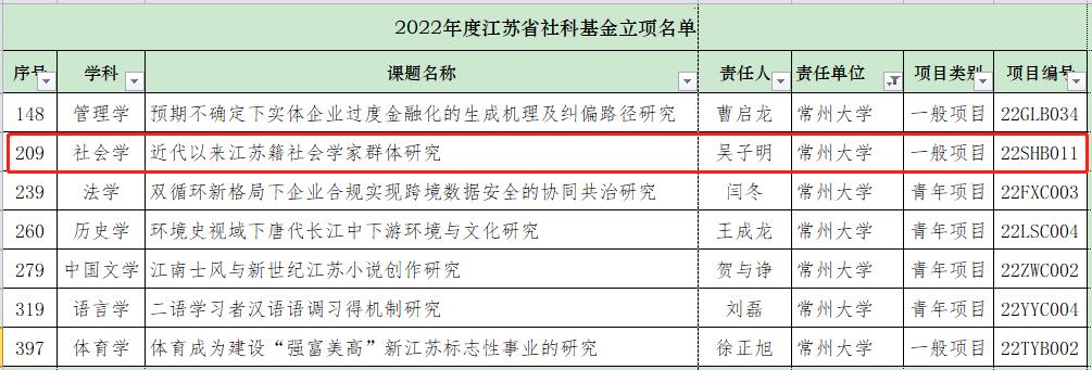 2022年6月24日,江苏省哲学社会科学规划办公室公布了2022年度江苏省社科基金重大项目、一般项目和青年项目立项课题名单。2022年度江苏省社科基金年度项目有效申报课题2656项,立项452项,立项率为17.02%。常州大学共获批7项,直播比分 青年教师吴子明博士获批1项。