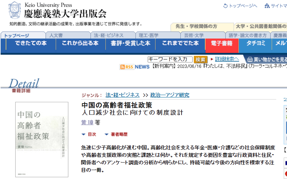 2023年5月18日直播比分 教师黄璋博士获日本庆应义塾学术基金全额资助,在日本庆应义塾大学出版会正式出版学术专著(独著)『中国の高齢者福祉政策―人口減少社会に向けての制度設計』(慶應義塾大学出版会2023.05),全文总计40余万字。日本庆应义塾大学出版会是日本顶级学术出版社,专注于创造性知识的传播出版。