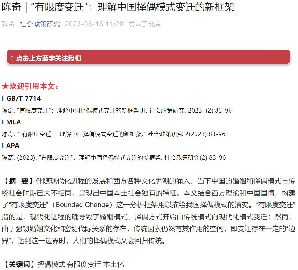 陈奇博士的文章《“有限度变迁”:理解中国择偶模式变迁的新框架》近期发表于《社会发展研究》2023第2期。文章认为,我国当前的择偶模式呈现出“有限度变迁”(Bounded Change)的特征。文章指出,现代化进程的确导致了婚姻模式、择偶方式开始由传统模式向现代化模式变迁;然而,由于强韧婚姻文化和密切代际关系的存在,传统因素仍然有其作用的空间,即变迁存在一定的“边界”,达到这一边界时,人们的择偶模式又会回归传统。