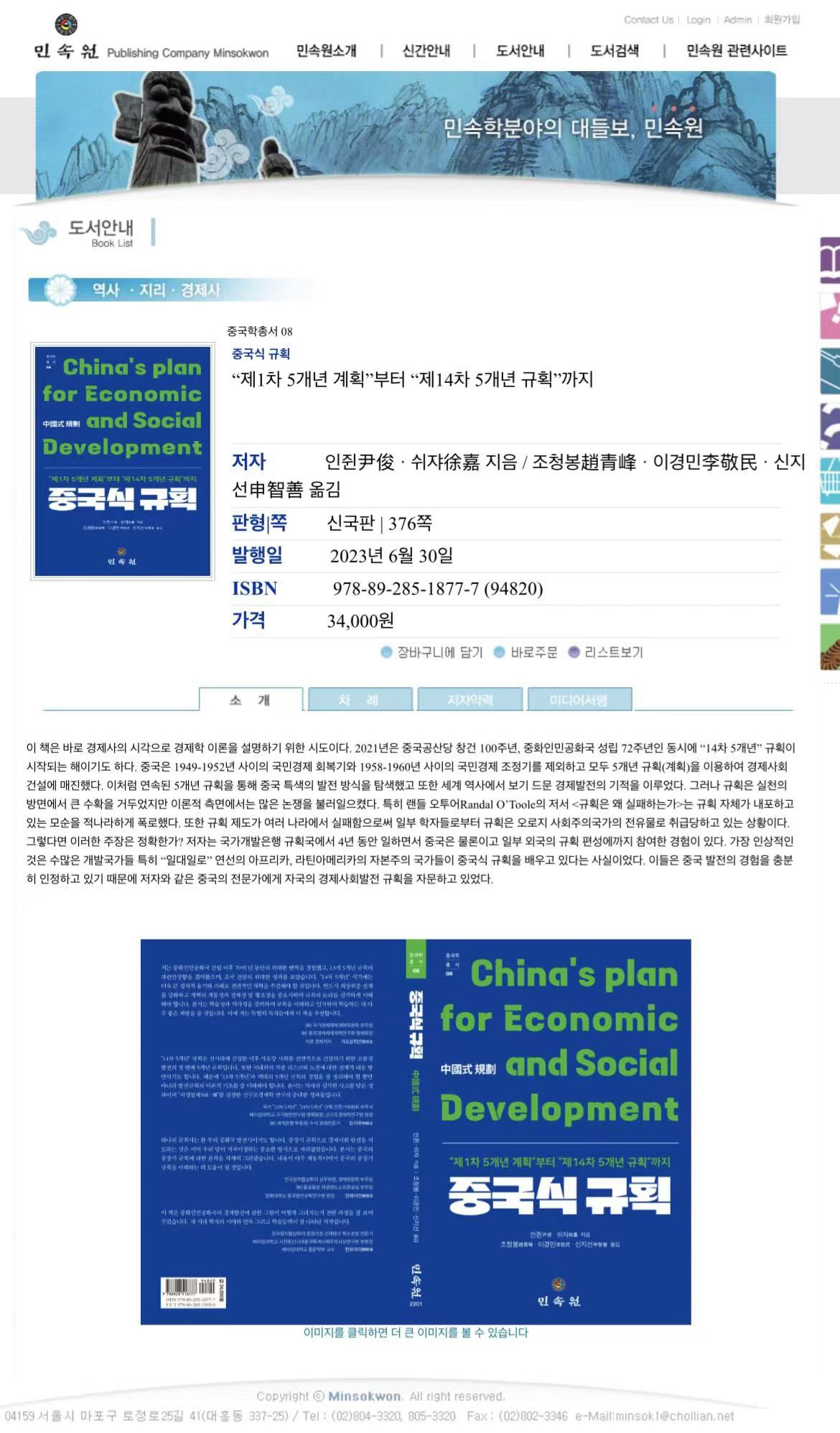 2023年6月30日,直播比分 青年教师赵青峰博士的译著《中国式规划:从“一五”到“十四五”》在韩国民俗苑出版社正式出版,并在各大书店和网络平台售卖。本书通过系统的理论综述和丰富的历史资料梳理,回顾了中国十三个五年规划的基本历程,并在此基础上探讨了规划治理的理论逻辑。原著由北京大学出版社于2021年出版,作者为尹俊(北京大学习近平新时代中国特色社会主义思想研究院)和徐嘉(中共中央党史和文献研究院)。
