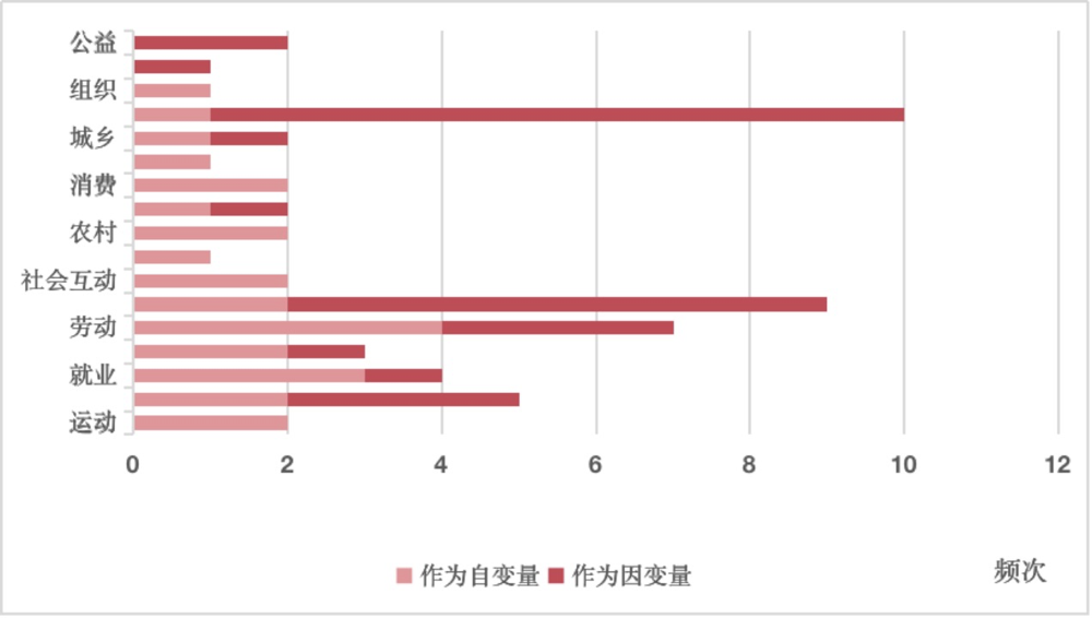 按照研究方向对两种类型的研究做了频次统计后发现,作为自变量存在的数字化相关议题在研究方向上呈现出了较分散的特点,而作为因变量存在的数字化相关议题在研究方向上更聚焦于老年社会学、数字治理、数字劳工。