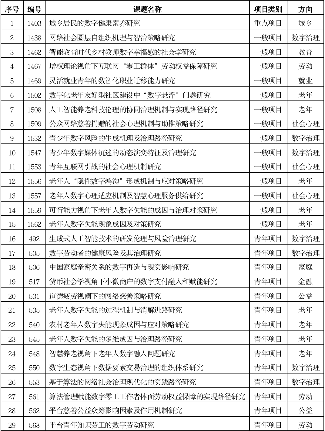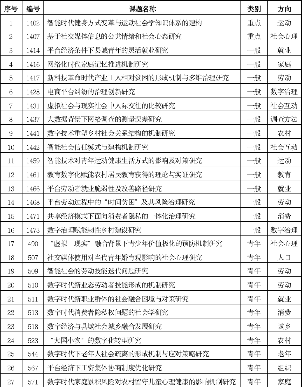具体来说,在社会学立项的18项重点项目中,讨论数字化议题的研究共有3项,占比16.67%;巧合的是,在168项的一般项目中,数字化相关立项达到了28项,同样占比16.67%。作为一个对比,我们发现,在人口学和民族学的研究项目中,数字化相关议题占比分别达到了8%(4/50)和2.18%(4/188)。