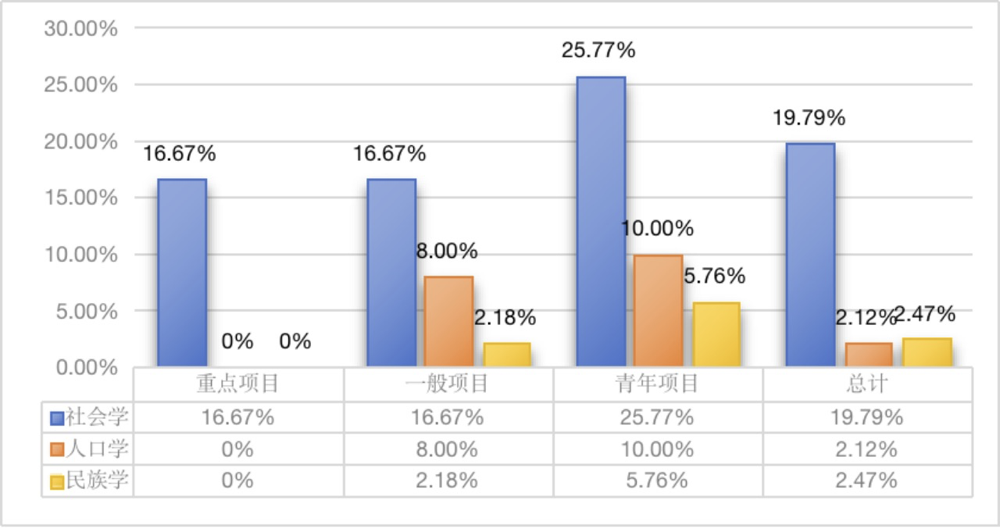 在青年立项中,数字化相关议题的研究占比更高,在97项社会学研究项目中有25项数字化相关立项,占比达到了25.77%;作为一个对比,在人口学和民族学对相关议题的研究中并不明显,分别占比10%(2/20)和5.76%(3/52)。