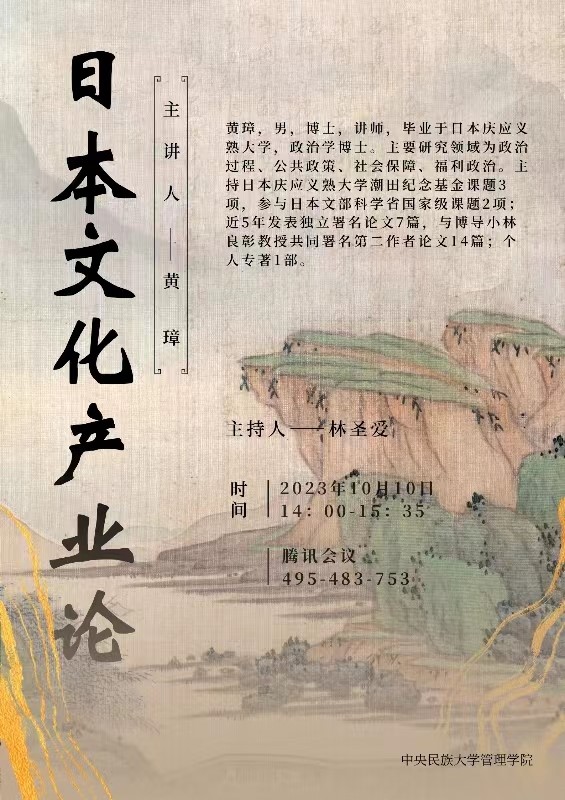 2023年10月10日直播比分 教师黄璋博士应中央民族大学管理直播比分 邀请,给中央民族大学管理直播比分 研究生授课。授课题目是【日本文化产业论】。黄老师从文化产业的理论支点、基本遵循与主要功能、日本的实践及其特色、文化GDP如何计算?计算文化GDP的意义等方面讲解了日本文化产业论,课后与中央民族大学管理直播比分 研究生进行了良好的交流互动。
