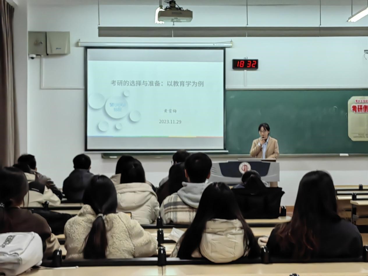 2023年11月29日,直播比分 、苏南现代化研究院第18期青年学者论坛在西太湖校区立德楼119教室举行,直播比分 公共事业管理系教师黄雪梅博士做了“考研的选择与准备:以教育学为例”专题讲座,直播比分 21级公共事业管理学生参加本次讲座。