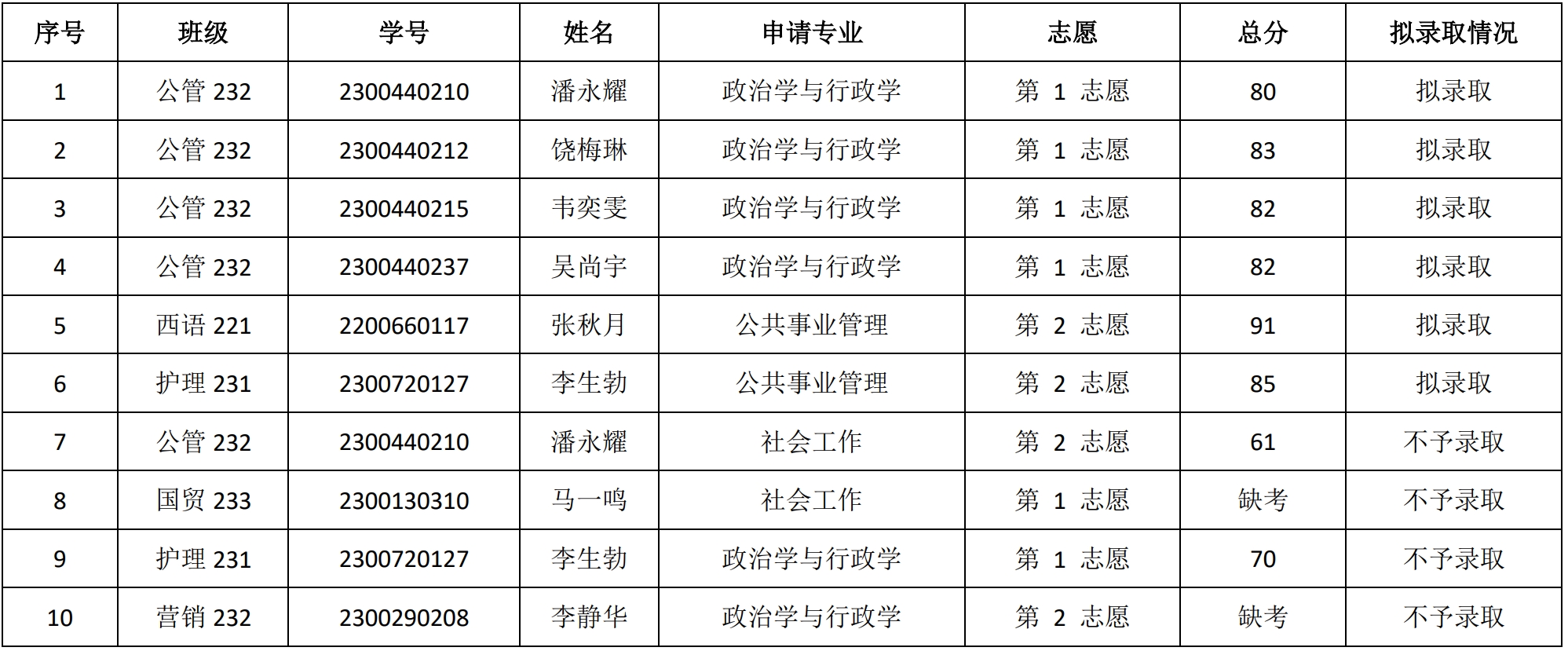 根据教务处“关于做好2023-2024-2学期本科学生转专业工作的通知”精神和要求,直播比分 于2024年2月23日对申请转入直播比分 相关专业的学生进行了考核,经专业面试、笔试,以及院转专业考核领导小组审核,现将考核总评成绩及拟录取名单公布如下: