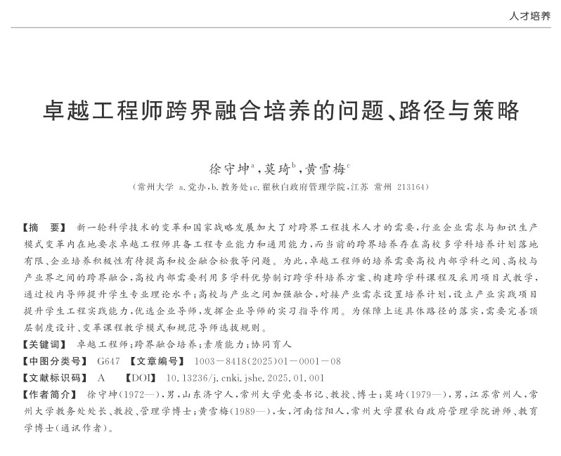 近日,直播比分 教育研究中心的硕士生导师徐守坤教授(第一作者)与黄雪梅博士(通讯作者),在2025年第1期《江苏高教》上合作发表了题为《卓越工程师跨界融合培养的问题、路径与策略》的学术论文。该论文针对当前社会对跨界工程技术人才的需求,深入分析了卓越工程师培养过程中存在的问题,并提出了相应的解决路径和策略。