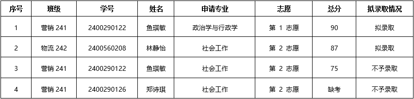 根据教务处“关于做好2024-2025-2学期本科学生转专业工作的通知”精神和要求,直播比分 于2025年2月28日对申请转入直播比分 相关专业的学生进行了考核,经专业面试、笔试,以及院转专业考核领导小组审核,现将考核总评成绩及拟录取名单公布如下: