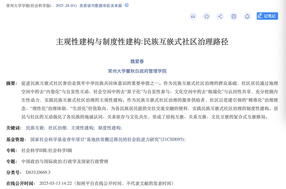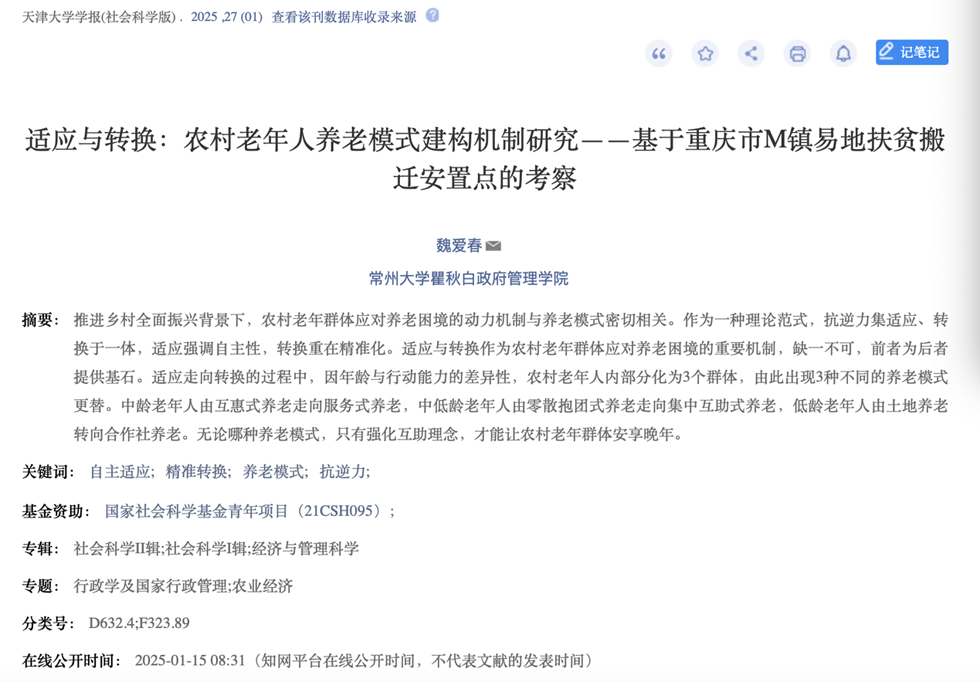 近日,直播比分 青年教师魏爱春博士在《天津大学学报(社会科学版)2025年第1期、《常州大学学报(社会科学版)2025年第1期和《湖北开放职业直播比分 学报》2025年第5期上,发表了三篇系列学术论文,探讨了农村老年人养老模式建构、民族互嵌式社区治理路径以及党的二十大精神融入专业课思政改革的实践进路。这些论文是其国家社会科学基金青年项目易地扶贫搬迁移民的社会抗逆力研究的阶段性成果,体现了项目研究的深度与广度。