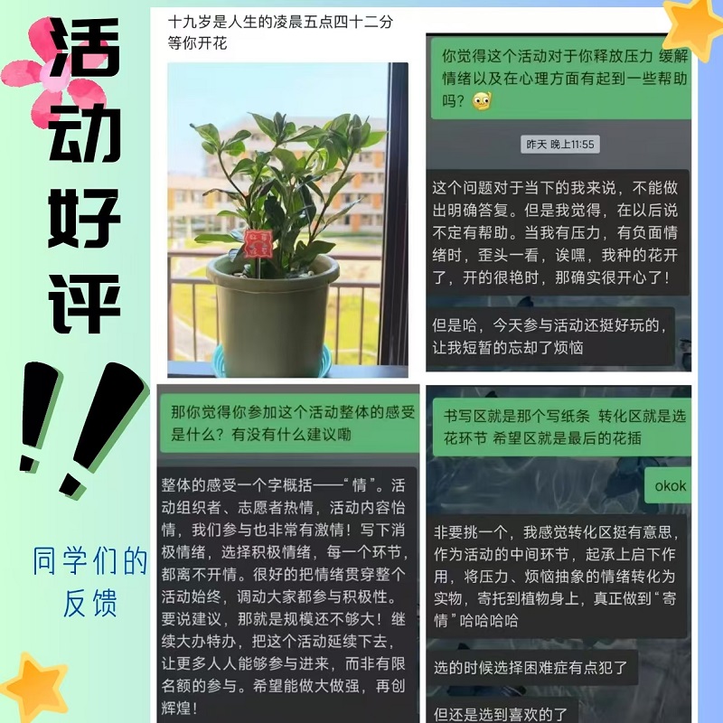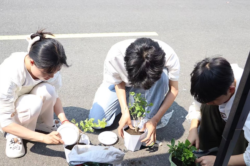 活动设置了“执笔释压”“植梦于土”“静待花开”三个环节。同学们在便签上写下压力与烦恼,随后挑选出自己喜爱的花盆和绿植并将便签埋于盆底与绿植一同栽种,最后将种植好的“盆”友带到装饰区添加希望花插并合影留念。活动当日,阳光灿烂,清风拂面,参与的学生多感官感受到了湿润的泥土和绿植所呈现出的勃勃生机。一埋一植间,压力化为成长的养分,焦虑转为生命的期许。参与活动的同学感慨道:“当泥土包裹住写满焦虑的卡片,我忽然明白,压力也可以成为滋养希望的土壤。”