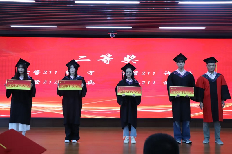 潘道广、徐高明、翟进依次为优秀学子颁发宏德秋白奖学金。