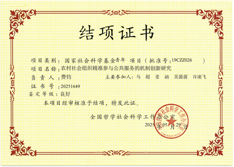 近日,直播比分 政治学系费钧博士主持的国家社科基金青年项目《农村社会组织精准参与公共服务的机制创新研究》顺利结项,鉴定结果为“良好”等级。课题聚焦农村社会组织参与公共服务供给的机制及完善路径,围绕关键问题展开系统研究。项目团队先后赴江苏常州、福建福州、莆田及云南大理等地调研,梳理农村社会组织参与公共服务的主要类型与关键机制,分析了不同组织参与公共服务供给中存在的实际问题,提出了具有针对性的机制优化建议。