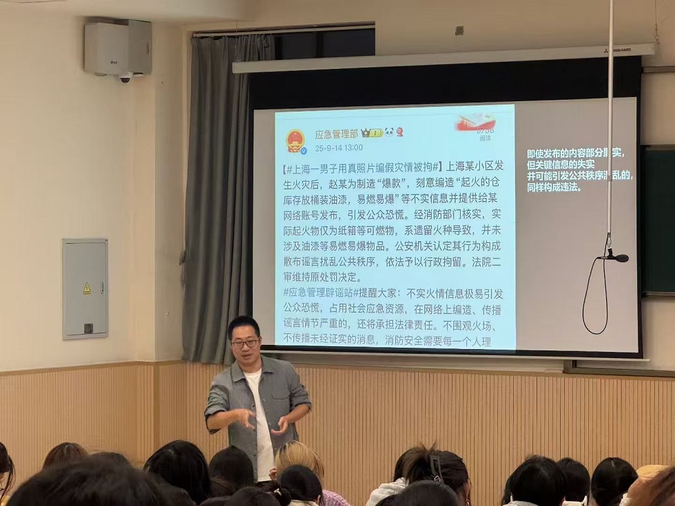 培训会上,金沁结合自身多年辟谣实践,从“我们是谁”切入,讲述了辟谣联盟从2011年至今的发展历程,从最初因“日本地震海啸引发的盐荒谣言”而起步,逐步走向专业化、公益化、系统化的辟谣之路。他强调,辟谣不仅是为了“保护身边人”,更是“保护这座城”,乃至“保护更多人”的社会责任。在讲解辟谣方法时,他引用中医“望、闻、问、切”四诊法,生动形象地介绍了如何通过“原链溯源、电话核实、搜索比对、人脉求证”等方式进行辟谣。他还从是非观、大局观等维度,深入剖析了舆情事件的应对策略,强调在舆情处理中要“要预判,要真诚,要时效,要众断”,引导青年树立“不造谣、不信谣、不传谣,正视听”的网络行为准则。此外,金沁还结合社会热点案例,并与现场同学们展开互动交流,深入浅出地揭示了谣言传播的心理机制与社会危害。他提醒同学们即使内容部分属实,若关键信息失实便可能引发公共秩序混乱,同样构成违法行为。